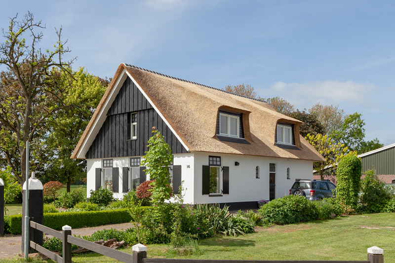Doordat het rieten dak aan vervanging toe was is er voor gekozen om direct geïsoleerde dakplaten toe te passen. Tevens zijn de dakkapellen vervangen en zijn de topgevels voorzien van nieuwe zwarte gevelbekleding.