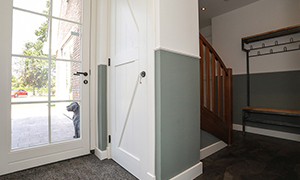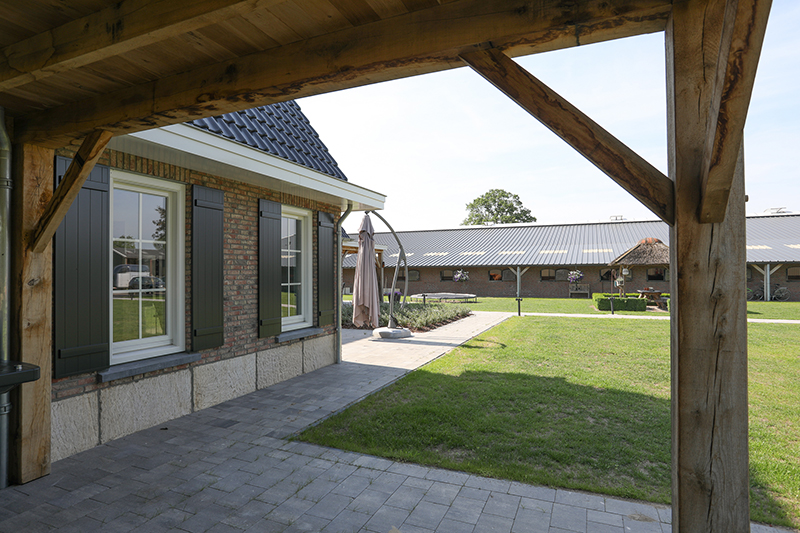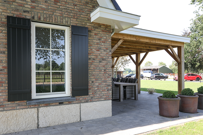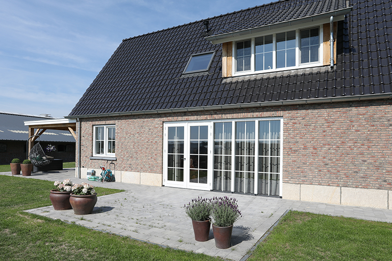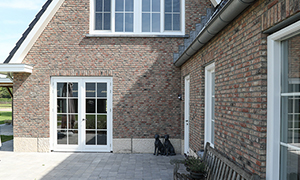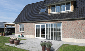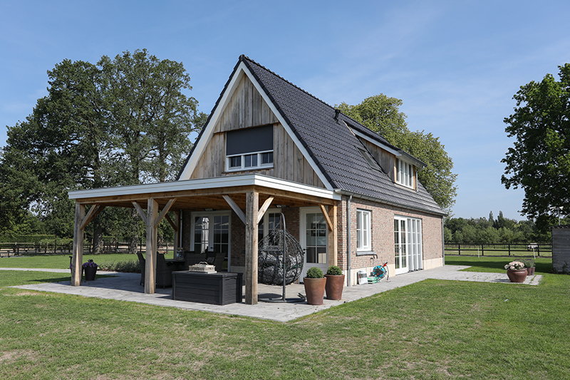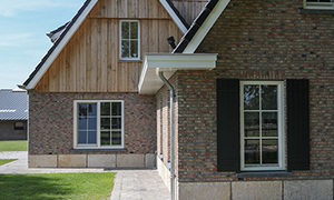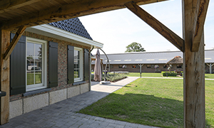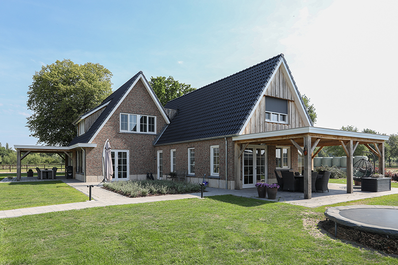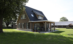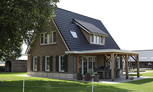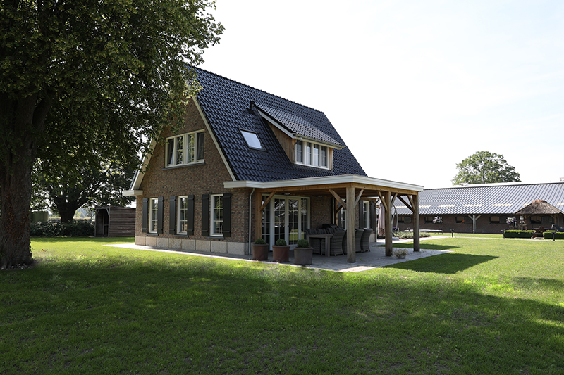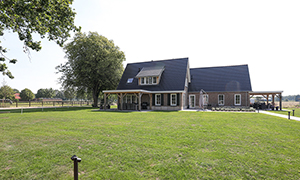- Materialen: Het buitenblad staat op de karakteristieke Bentheimer zandsteen, daarop is een genuanceerde gevelsteen gemetseld in wildverband. De verdiepingsvloer bestaat uit een breedplaatvloer waarin alle leidingen t.b.v. de diverse installaties zijn weg gewerkt. Door de keramische dakpannen, onderhoudsvrije luiken, eiken topgevels en overkappingen word het een kwalitatief hoogstaande woning.