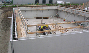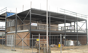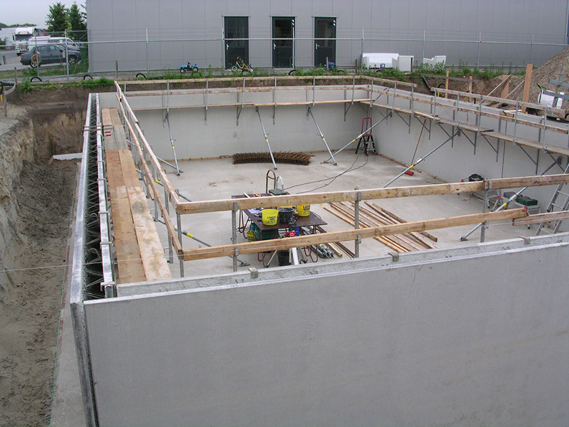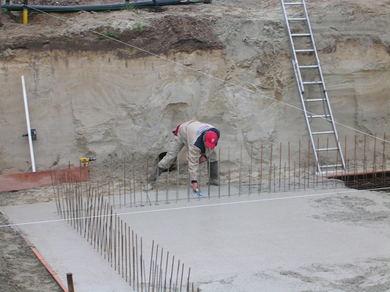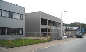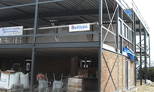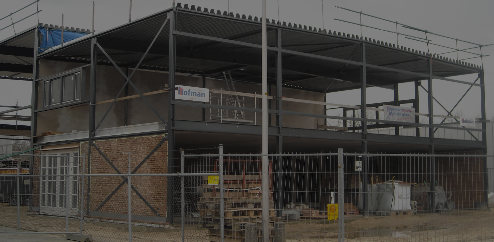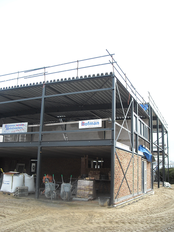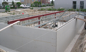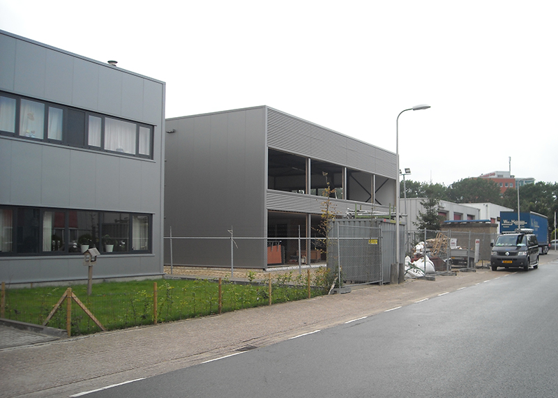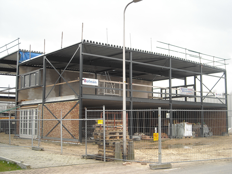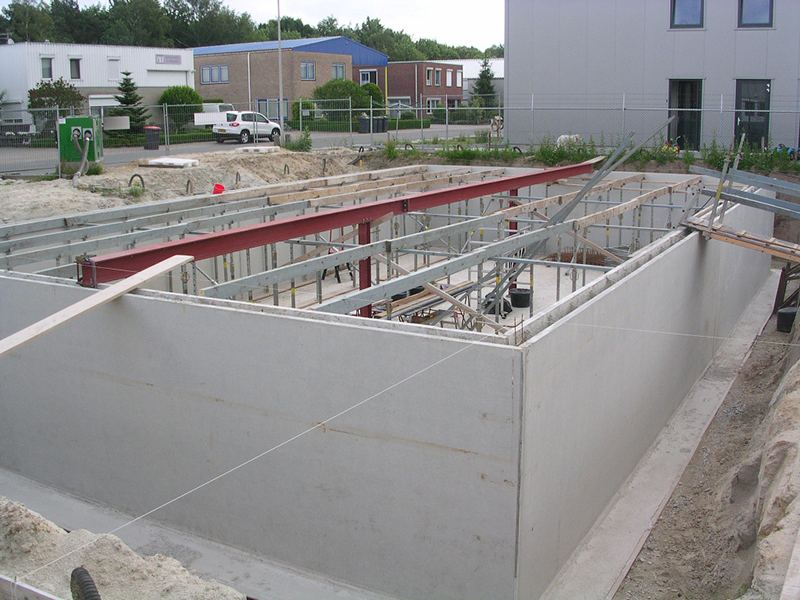 Bedrijfshal met inpandige kantoren. Kantoorgedeelte is compleet onderkelderd door middel van prefab holle wandelementen met breedplaatvloeren die in het werk zijn afgestort .