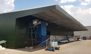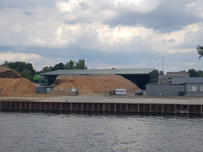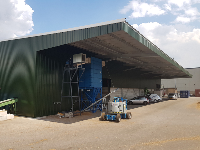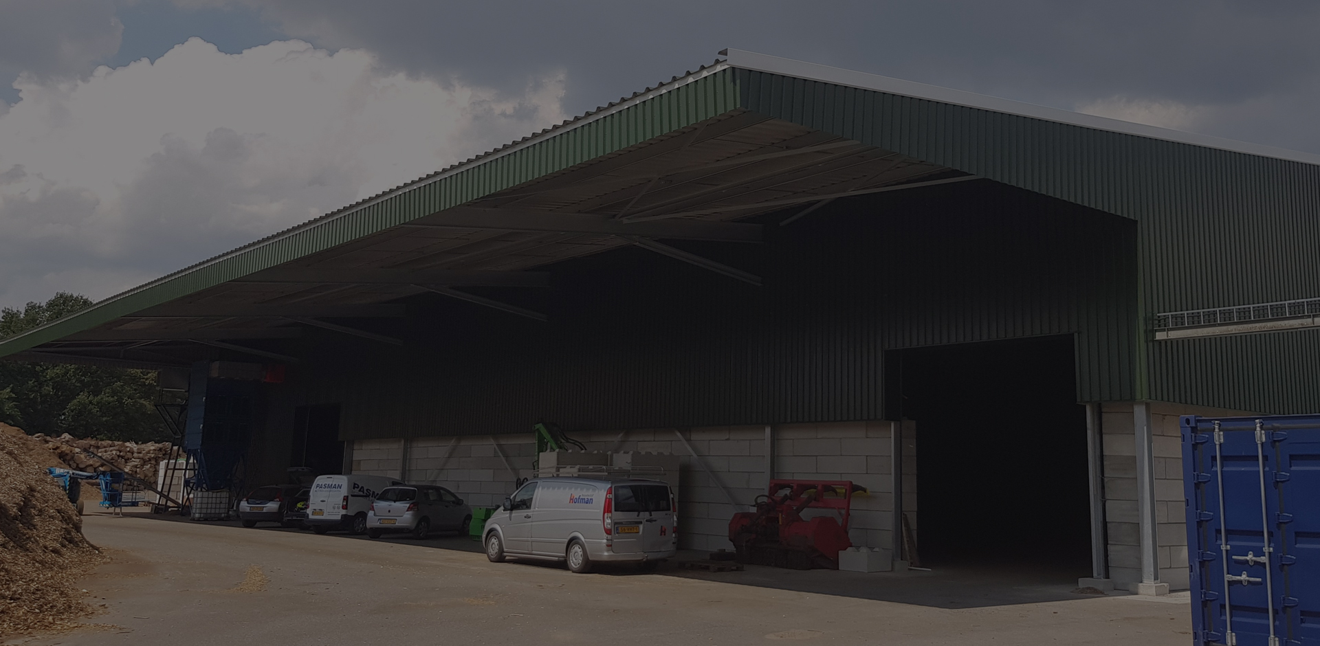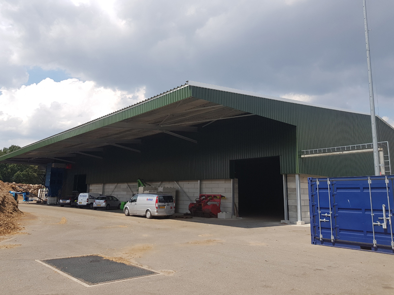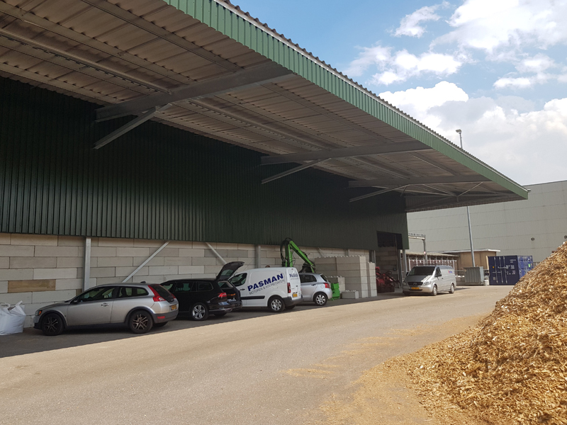 - Materialen: Verzinkte staalconstructie met damwand beplating op het dak en de wanden. Ter plekke van de opslag van houtpellets is de dakbeplating van binnenuit geisoleerd. De onderzijde van de wanden bestaat uit betonnen megablokken.