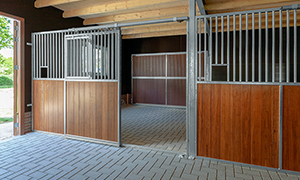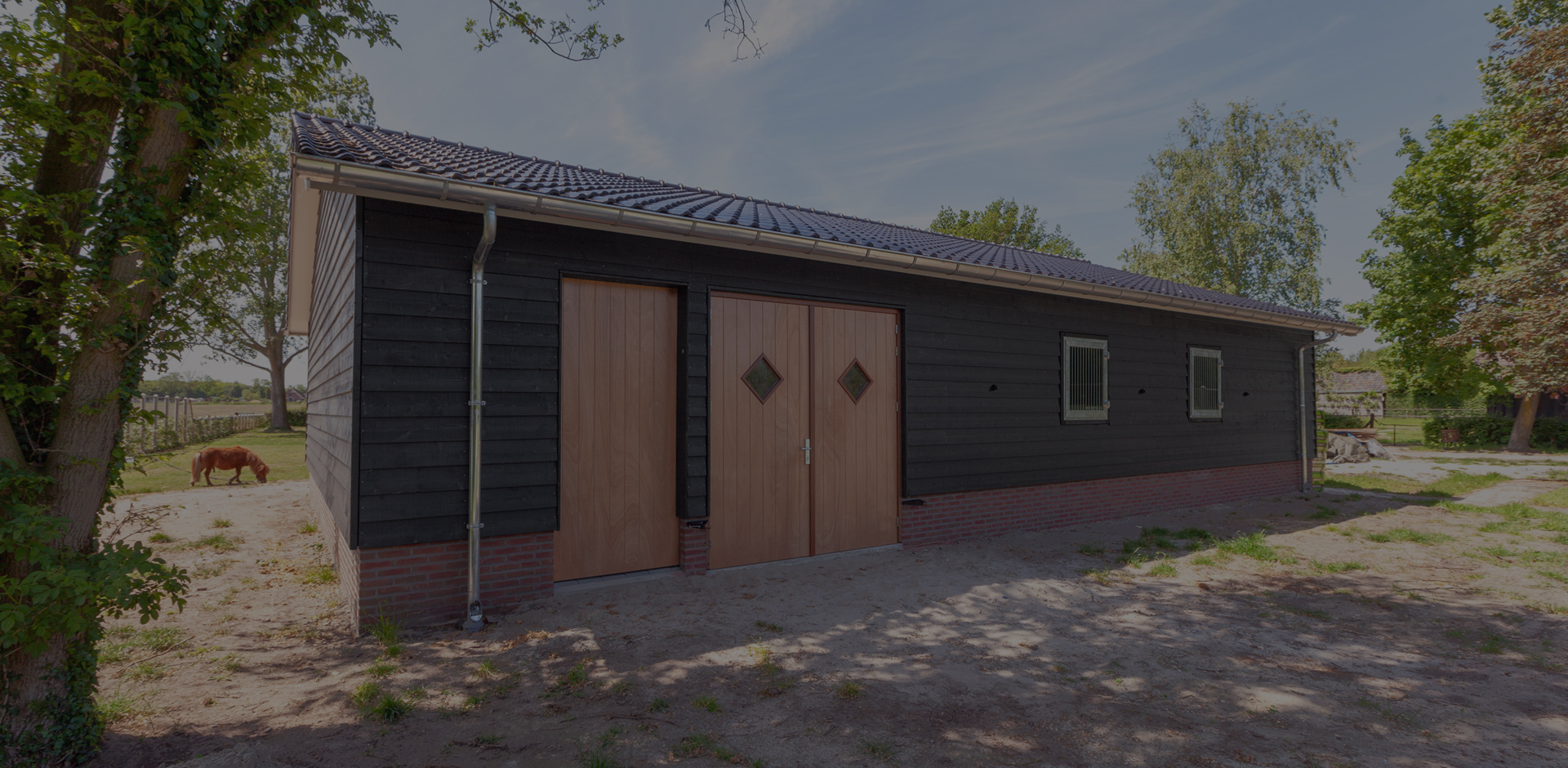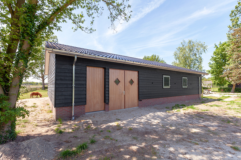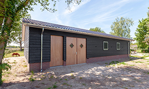 - Materialen: De schuur is voorzien van een trasraam met daarop houtskelet wanden. Deze zijn aan de binnenzijde bekleed met betonplex en aan de buitenzijde met zweeds rabbat in zwarte uitvoering. De hardhouten kozijnen en deuren zijn blank afgelakt voor een fraaie uitstraling. Zowel het dak van de schuur als van de woning zijn voorzien van nieuwe gebakken dakpannen. Binnen in de stalgang is straatwerk aangebracht voor voldoende grip van de paarden.