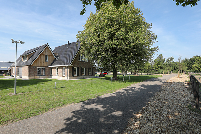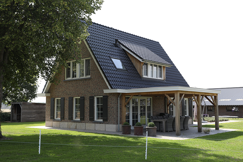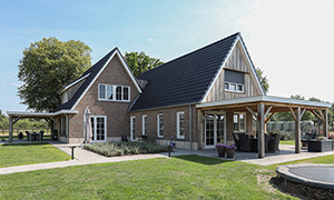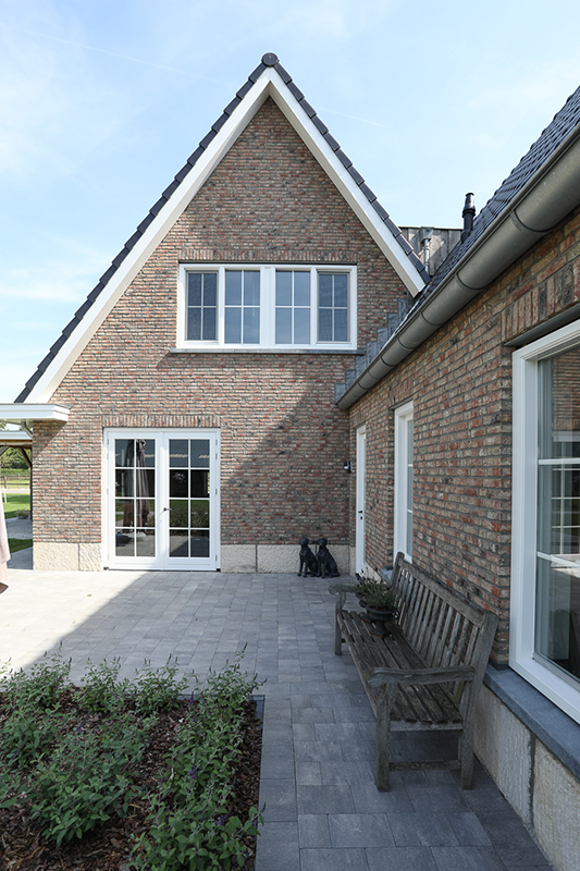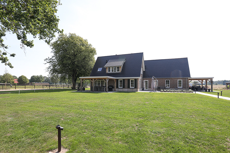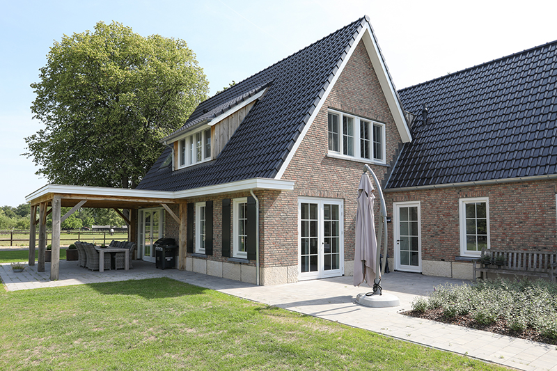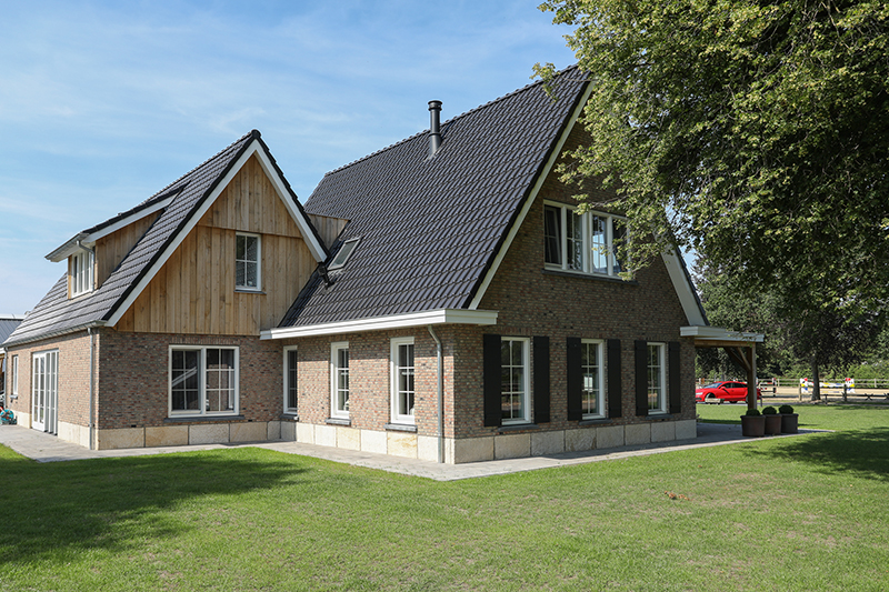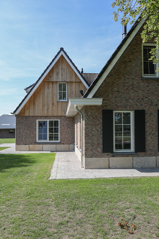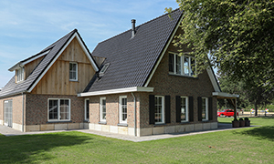 - Materialen: Het buitenblad staat op de karakteristieke Bentheimer zandsteen, daarop is een genuanceerde gevelsteen gemetseld in wildverband. De verdiepingsvloer bestaat uit een breedplaatvloer waarin alle leidingen t.b.v. de diverse installaties zijn weg gewerkt. Door de keramische dakpannen, onderhoudsvrije luiken, eiken topgevels en overkappingen word het een kwalitatief hoogstaande woning.