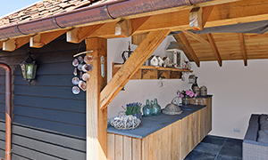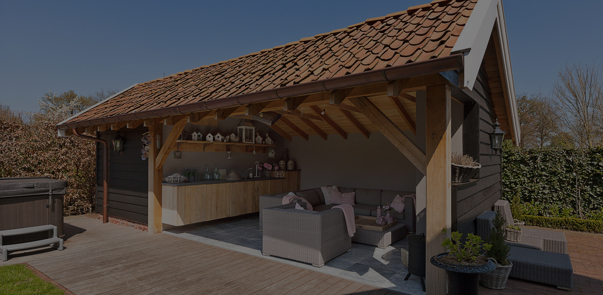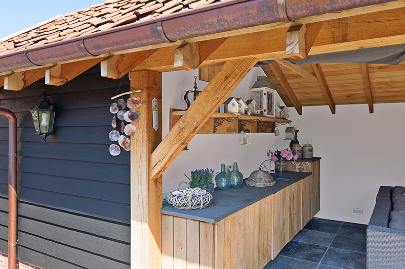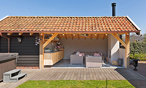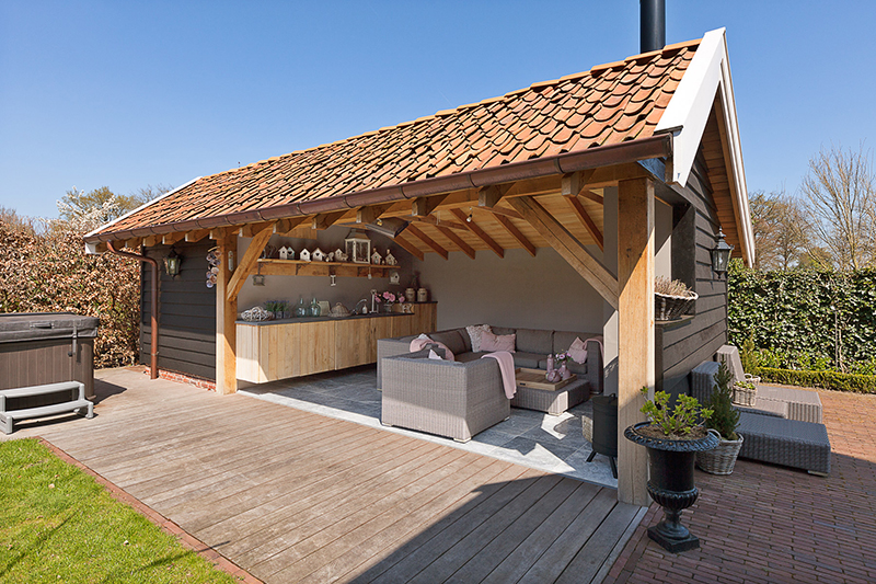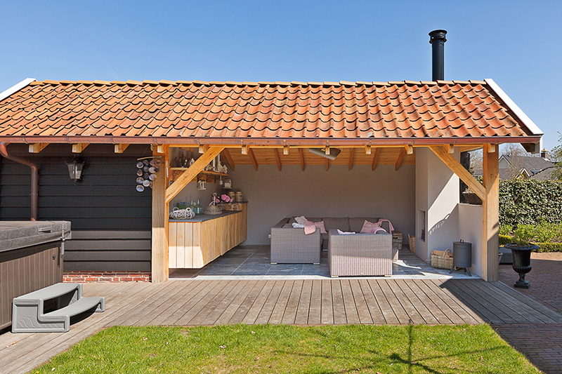 Deze eiken overkapping met buitenkeuken is voorzien van een gemetselde houtkachel, kleedruimte met douchevoorziening en toilet t.b.v. jacuzzi op de hardhouten (Afri Kulu) vlonder. Aparte gas, water, stroomvoorziening en een cv ketel voor douche en vloerverwarming.