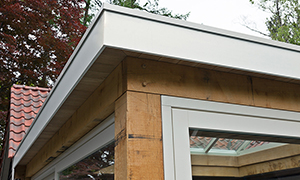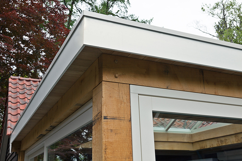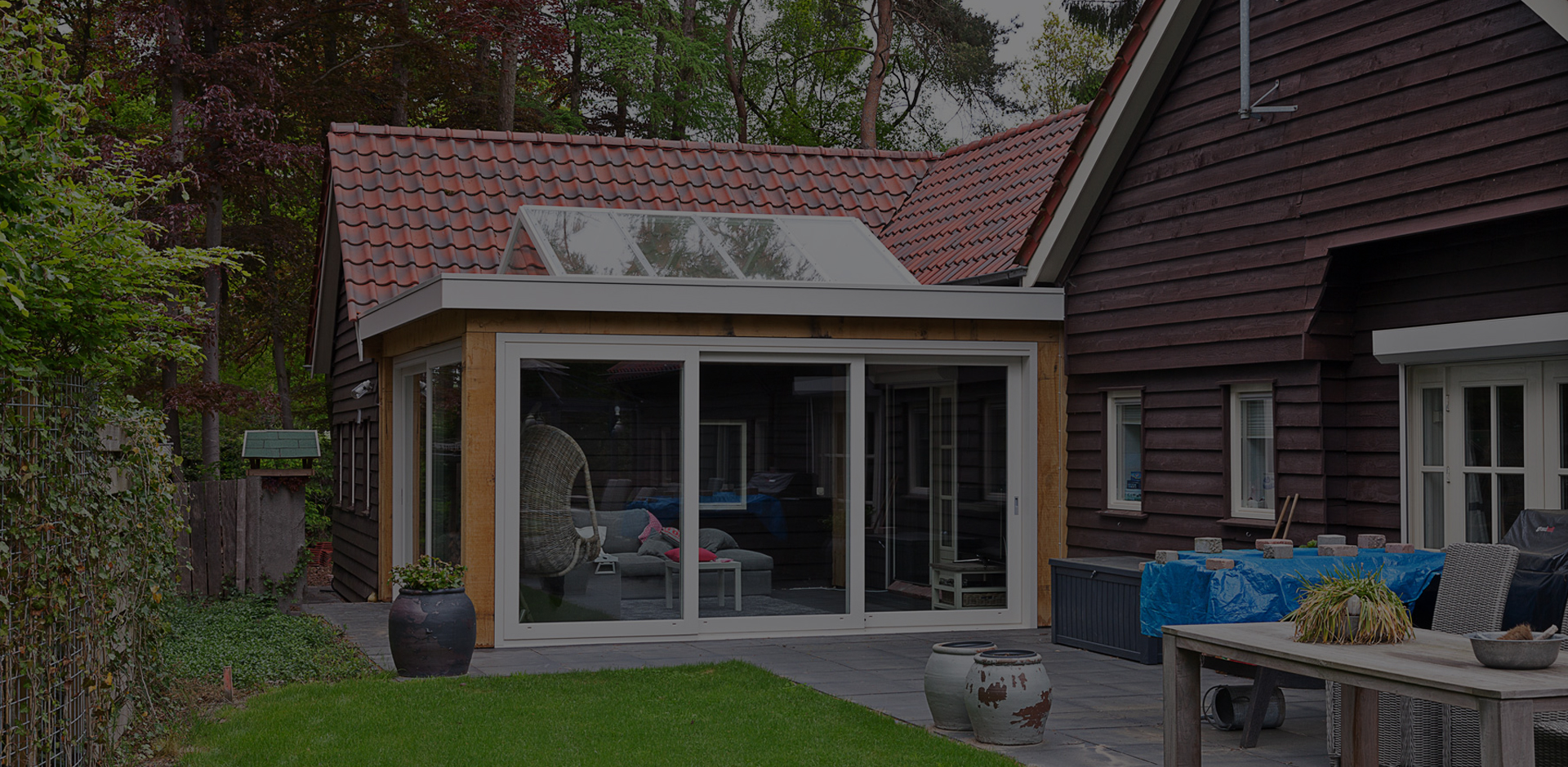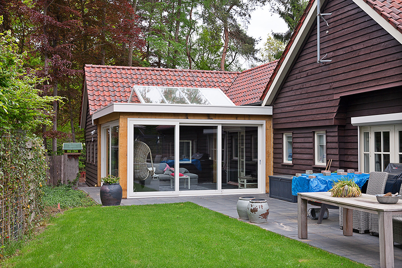 Deze luxe eiken serre met veel lichtinval kan elk jaargetijde perfect benut worden door de grote schuifpuien.