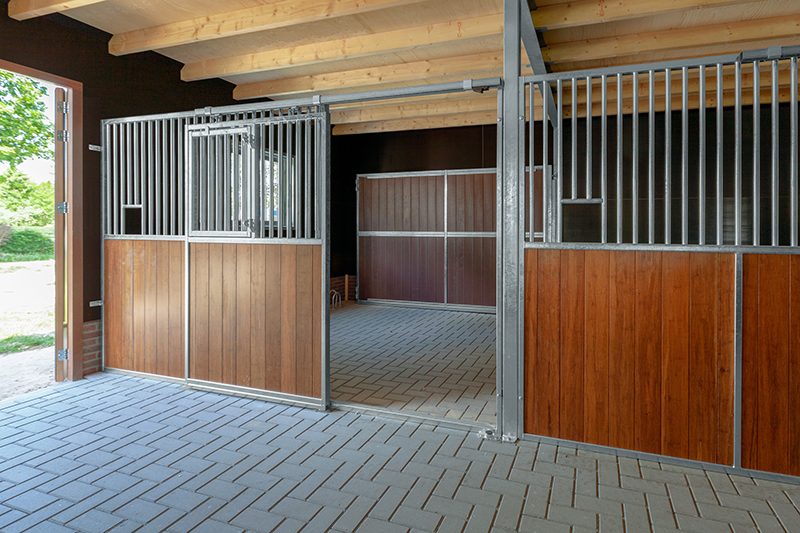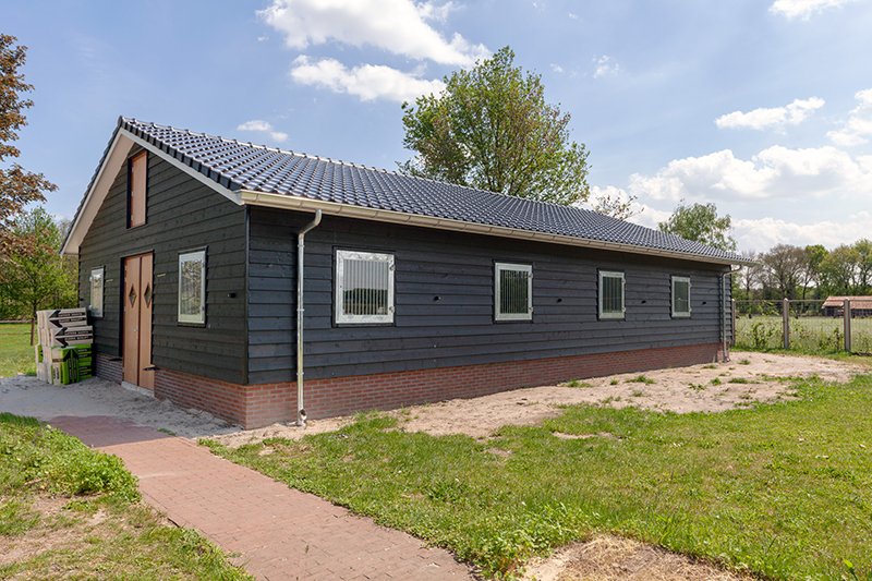 - Materialen: De schuur is voorzien van een trasraam met daarop houtskelet wanden. Deze zijn aan de binnenzijde bekleed met betonplex en aan de buitenzijde met zweeds rabbat in zwarte uitvoering. De hardhouten kozijnen en deuren zijn blank afgelakt voor een fraaie uitstraling. Zowel het dak van de schuur als van de woning zijn voorzien van nieuwe gebakken dakpannen. Binnen in de stalgang is straatwerk aangebracht voor voldoende grip van de paarden.